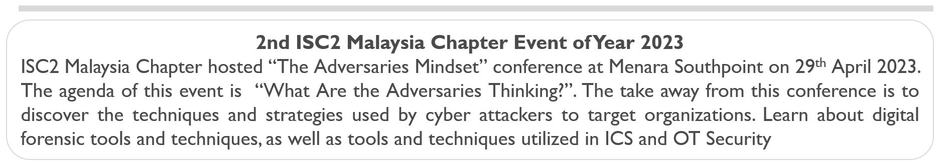 © 2023, ISC2 Malaysia Chapter. ISC2 Inc., All Rights Reserved. ISC2, CISSP, SSCP, CCSP, CGRC, CSSLP, HCISPP, CISSP-ISSAP, CISSP-ISSEP, CISSP-ISSMP and CBK are registered marks of ISC2, Inc.