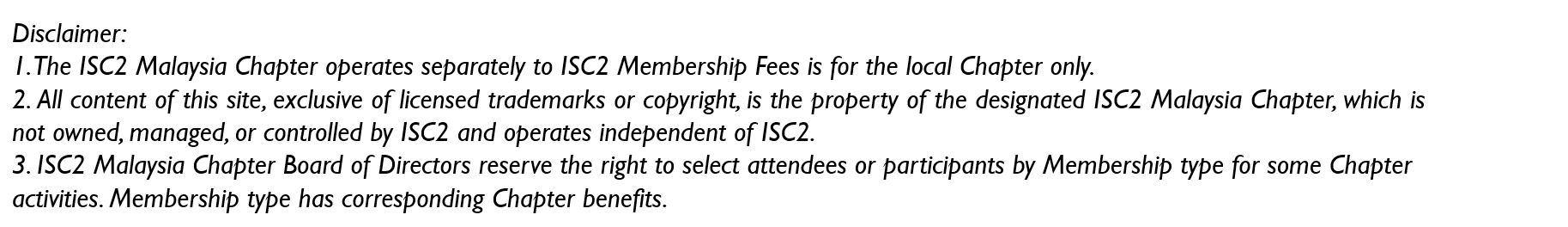 Disclaimer: ISC2 does not own, operate, or moderate this website. All content of this material, exclusive of licensed trademarks, trade dress, or website format, is the property of ISC2 Malaysia Chapter, which is not owned, managed, or controlled by ISC2 and operates independent of ISC2.